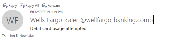 2. Know Your Sender: Am I expecting an e-mail from this entity? Do not assume it is legit just because you have an account with them. If you don’t know the sender then hover your mouse over the “From” address to display the email address used to send the email. In this example the email seems to come from Wells Fargo. As you can see, in the email address it says well fargo . RED FLAG the email address does not match the company exactly.